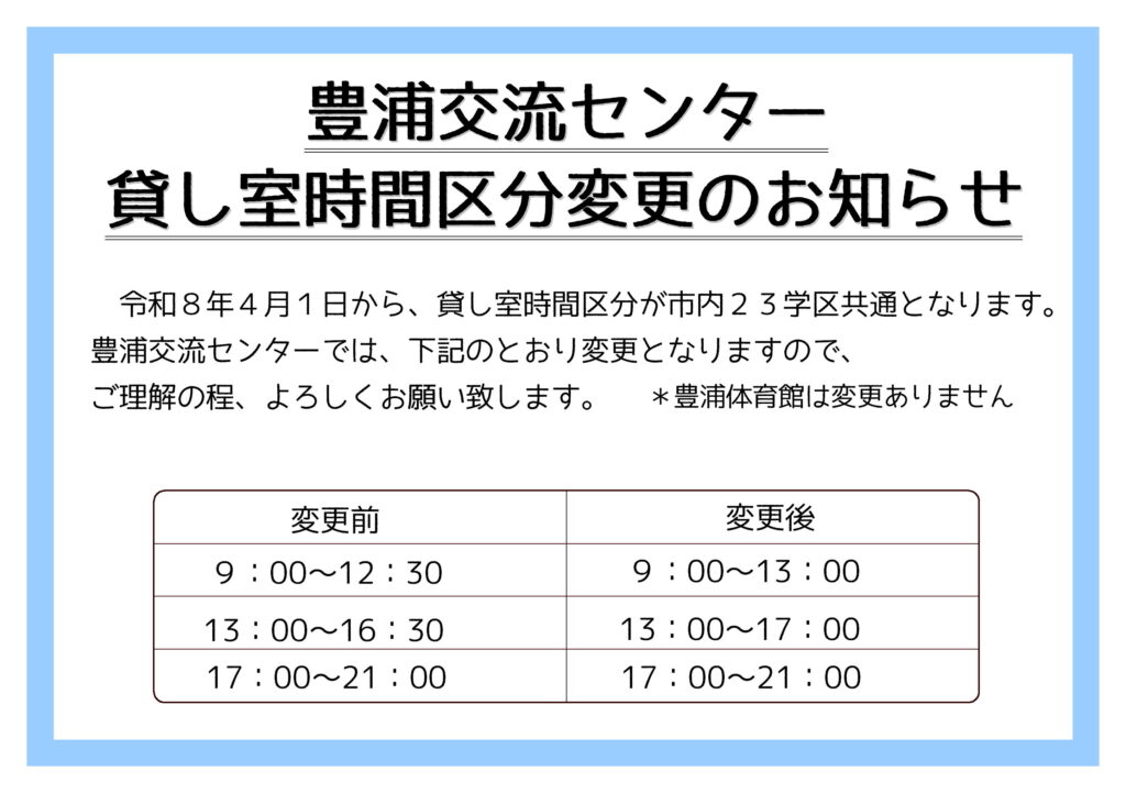 お知らせ ホーム > お知らせ一覧 > お知らせ > 交流センター貸し室時間区分変更のお知らせ お知らせ 202602.17 交流センター貸し室時間区分変更のお知らせ 前の記事へ お知らせ一覧にもどる 次の記事へ